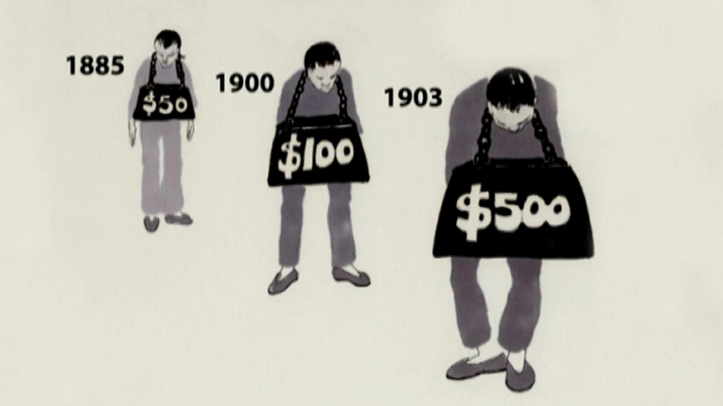The “othering” of the Chinese population was furthered during the creation of the Exclusion Act and the Head Tax, which are, as is defined in the film’s National Film Board of Canada (NFB) synopsis, “a set of laws imposed to single out the Chinese as unwanted immigrants to Canada from 1885 to 1947.” These strict laws forcing migrants to leave the continent or pay a heavy fee – now equivalent to the price of two houses – to re-enter the country are clear indicators of Canada’s disdain regarding Asian immigration. This racialization was equally present when Asian migrants found their place within British Columbian society. The city of Vancouver itself was – and in some areas still is – separated into cultural boroughs. Nicholas Blomley writes about Vancouver’s Japanese Canadian sector and the “long established Chinatown”: