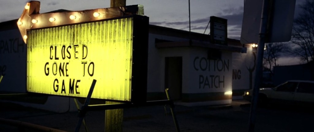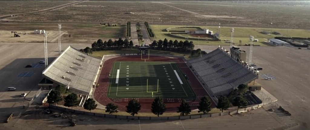 Odessa is painted as a blip on the face of the world map, an empty, barren place that just so happened to have people move in and inhabit it. Its culture is never well defined, its tenets are lacking, and its livelihood seems to be bolstered by being a place of mining and oil-rigging. The film opens with disparate shots of open fields and giant undefined pieces of machinery sucking the lifeblood from beneath the ground, a familiar site that continues to be dotted throughout the movie. Hang-out spots seem scarce, with a local bustling diner and house parties being the only places for youthful mingling. Malls seem to be unheard of, and the most exotic location is a Walmart, which itself isn’t even safe from the influence of football, as Coach Gaines is vaguely threatened in the parking lot about what may happen if he doesn’t lead the team to victory. There’s no alternative art or culture, the success of football is the only outlying hope in a sea of emptiness.