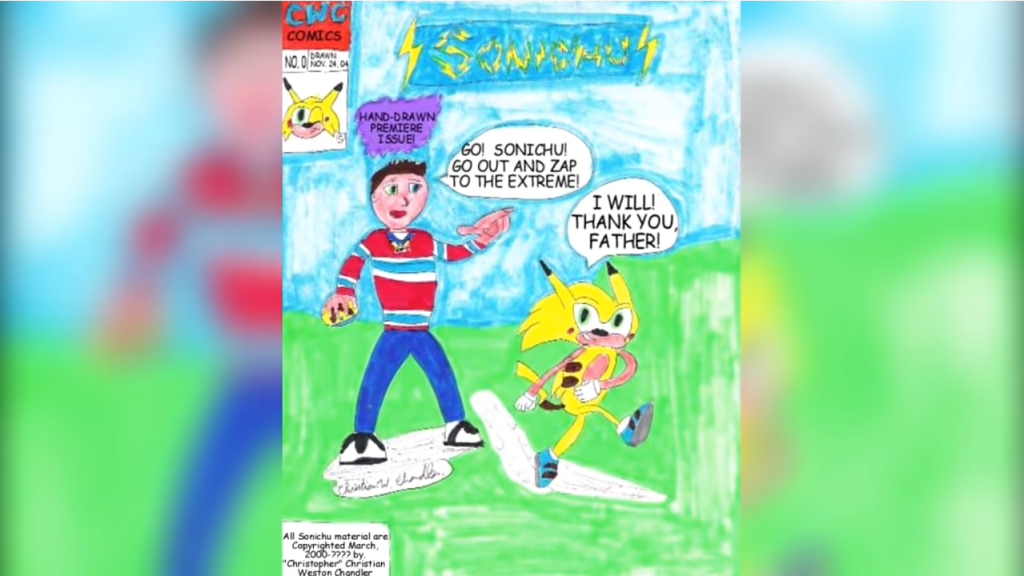 “Hello ladies and gentlemen, girls and boys, and dudes of all teen-ages as well as the uh… gals. My name is Christian Chandler. I am here and y’all are there.” The awkward and nasally voice gives way to a two-note piano solo as the screen shows a short burst of video clips: A man outside a house. A boy with a bowl cut and a striped shirt being interviewed on TV. A plasticine portmanteau of Sonichu — a cross between Sonic the Hedgehog and Pikachu strung onto a necklace.