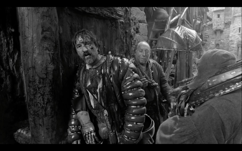 In Hard to be a God, German represents a double consciousness of the protagonist. One has to distinguish between the personalities of Anton and Don Rumata, with the former having to follow the guidelines of scientific research and the latter listening to his humane moral conduct. Unlike his colleagues who have succumbed to drinking in the secluded community outside of the main city, Anton remains a professional who performs the role of the noble Count. The corruption of Arkanar’s lifestyle seemingly does not affect him in the first part of the film, as he is calmly fulfilling his humble mission of protecting the remnants of intelligence by saving writers and scientists. Through the successful masquerade of the rowdy Count, he is able to maintain his disguise and scientific work. Anton is a representation of both an unbiased scientist that carries out an experiment and a Biblical figure of God who is observing the people from a superior perspective, allowing them to solve their problems on their own. However, he develops a condescending and pitying attitude towards the unfortunate inhabitants of the planet. Anton is constantly juxtaposed to the crowd in the black-and-white world of filth, with his face lit brighter than the others.