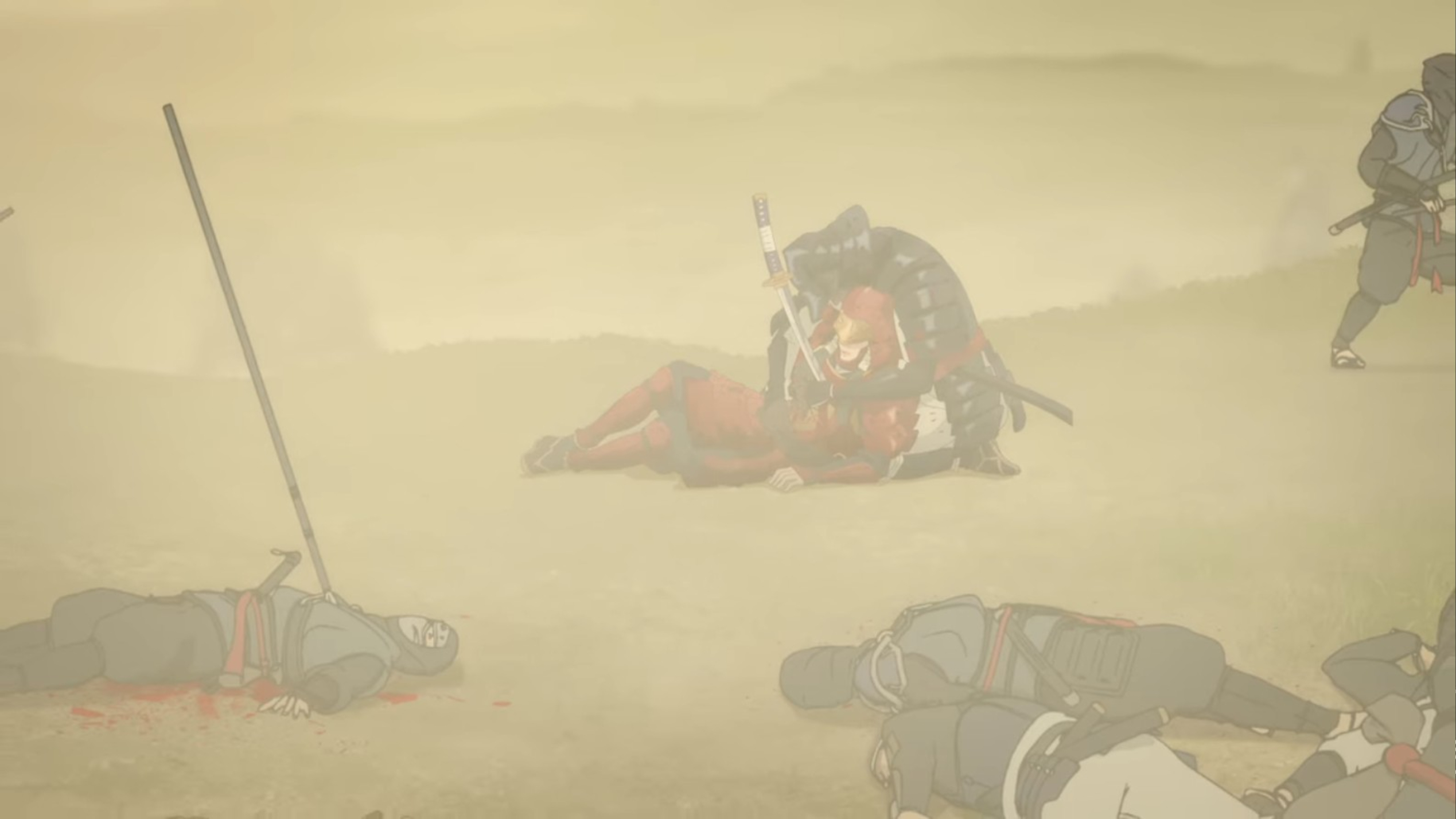 When it is later revealed that Natsumaru betrayed Nobunaga (not only as part of the Iga clan but as Hattori Hanzo’s besshikime), she confronts Yasuke of his knowledge of her treachery on the battlefield. Yasuke, unarmed with Nasumaru blocking his way after saving his back, says that she fights with no honour and that their relationship has only been one of a “spy and a mark.” As Yasuke turns his back on Natsumaru (as he had done earlier), Natsumaru strikes at his turned back, refuting his perception of her, even if it costs her life and their relationship. Each with their own honour to defend, Yasuke kills Natsumaru in one strike—who utters the words “not all” in her final moments. Natsumaru’s death torments Yasuke as he is on the cusp of life and death, tortured by the mutant preacher after refusing to give up Saki, reliving the consequences of his actions as reality and memory surface in his subconscious. After both Yasuke and Saki survive the preachers’ treachery, Yasuke continues to do whatever he can to support Saki—acting as Ichika would have wanted and honouring her by bringing her daughter to the special doctor Morisuke, not to heal Saki but to train her.