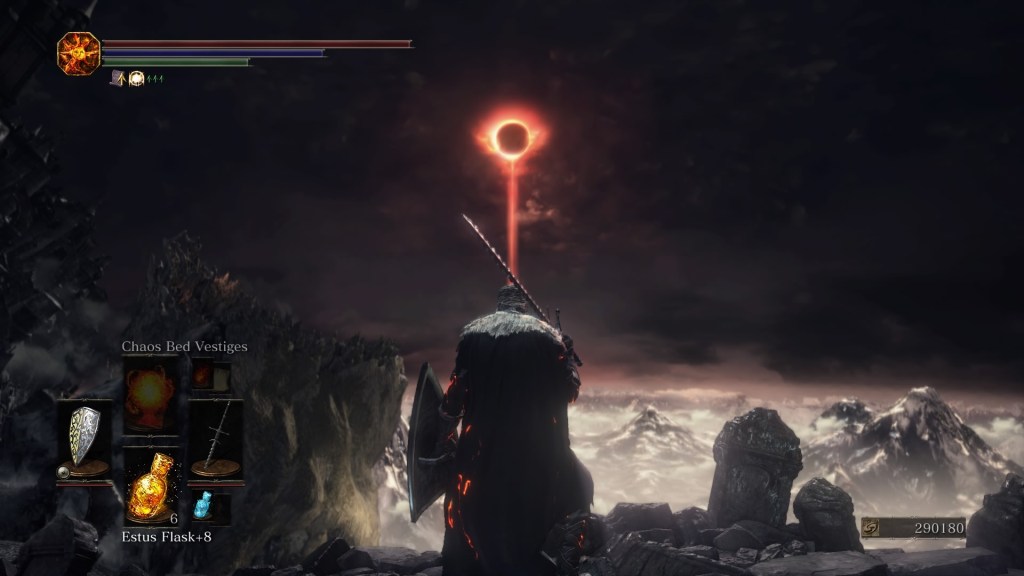 At the end of Dark Souls, you are asked to make a choice: To rekindle the flame as Gwyn once did (having defeated him in combat and finally put him to rest), or to let the world fade into darkness. There is a highly nuanced discussion to be had about the dimensions of this choice; linking the fire is depicted as the rational, noble thing to do, but considering the state of the world puts this into question. Doubly, it is unclear what darkness truly means. Darkness is suggested by certain characters as the true course of nature, but this is seemingly contradicted by seeing this manifest in the horrifying “Abyss” in the Dark Souls DLC (downloadable content) chapters. However, the proverbial rug-pull of Dark Souls III is that it acknowledges the futility of either choice along the binary; in this game, the flame is fading once again, having ostensibly been rekindled hundreds of times since our journey in the original game. In this cycle, the “Lord of Cinder,” the one chosen to rekindle the First Flame, Prince Lothric, has refused the call. In response to this, an unseen entity has reawakened previous Lords of Cinder, and they, too, all refuse the chance to do it again. In a final, desperate attempt to prolong the Age of Fire, the powers that be reawaken the “Unkindled Ash,” people from ages past who attempted to link the fire but for a number of reasons were unsuccessful. You, the player, are one of these countless Unkindled Ash.