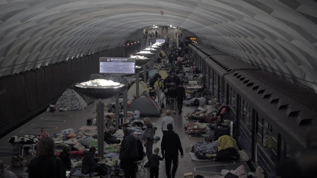 The notion of community, and specifically of the newfound family is a recurring topic in the documentaries that deal with civilians in the territories, which do not have active warfare, yet still are affected by the very context of the country at war and the constant threat of missile attacks. 89 Days by Pavlo Dorohoi for instance focuses on the people who had taken refuge in the Kharkiv metro, their make-shift camps on the platform and trains, as well as their relationship with each other. People bringing their plants, belongings, and animals transform the space of mundane passing into a new home, where strangers are now bonded over tragic circumstances. Specifically, one family and their escapee cat become the focus of the film, as the child shows and explains the drawing of their family’s temporary setup to the operator. The only connection to the outside in this category of films is the mobile screens that project horrific imagery of war into the safe and homey commune underground. The people here are not represented in the distanced attitude of pity, but on the contrary, the film passes a critique onto the government in handling the situation, accommodating the citizens, and later evicting them. The notion of pride here is quite important in understanding the position of the civilians and filmmakers, as despite horrific circumstances one still aspires to maintain their appearance and way of life like women getting their nails done on the station in an attempt to maintain their mundane habits.