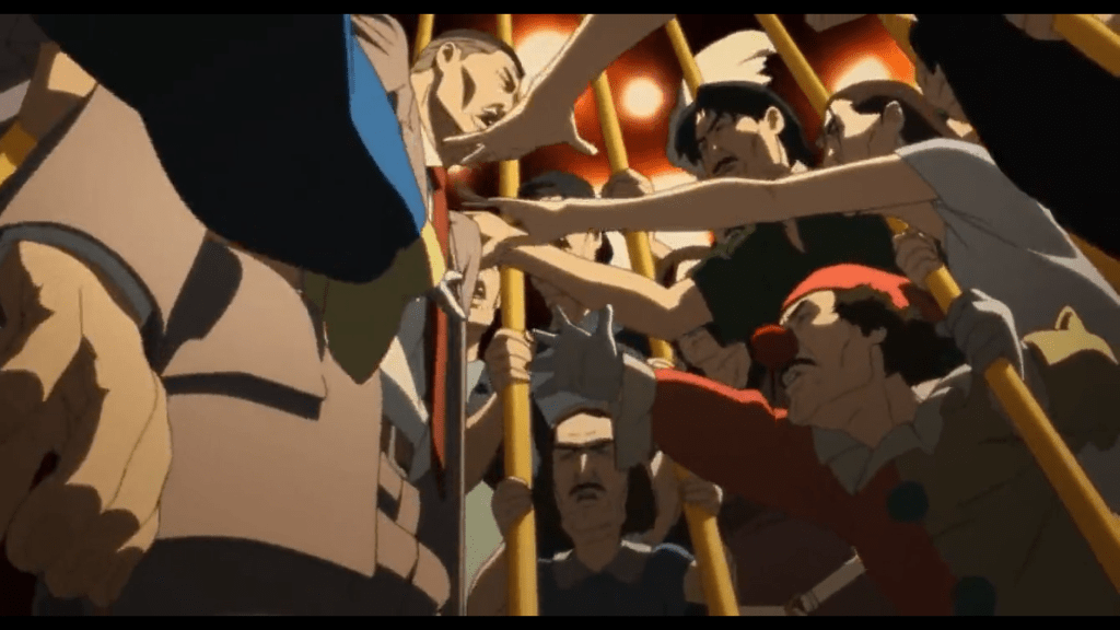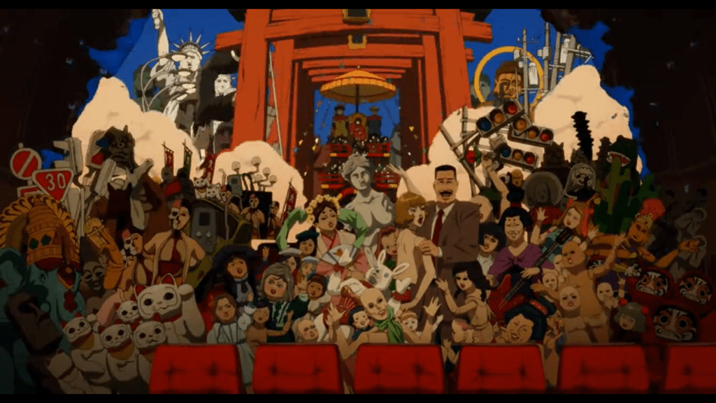 In this same manner, Paprika catches up to and merges with the form of Dr. Chiba Atsuko, a psychiatrist and researcher, she’s confronted with the theft of a psychotherapy machine called the DC mini. Atsuko quickly moves to action after Dr. Kosaku Tokita and Chief Toratarō Shima are called upon to assist in de-escalating the matter with company Chairman Inui. Knowing the potential risk and misuse of the machine without having access controls programmed into the apparatus, the Chairman rebukes the technological abomination that invades the mind. Referring to the rumours of a dream girl named Paprika as a terrorist and the number one suspect of stealing the DC mini, Atsuko defends the purpose of the device to help those in need. Shima agrees with Atsuko, and similar to the opening of the film, by the time we figure out what’s happening, meaning has devolved, and the symbolic order that upholds our reality begins to unravel at the seams. And no sooner than we’ve begun to catch up, the Chief has leapt out of a window laughing a few stories high–while shortly after, in the midst of a parade of recognizable symbols and icons of various imagined and real objects, march us into the grand illusion of the spectacle with the Chief as its appointed head. The soundtrack of the dream parade sweeps over the senses in a wonderful explosive melodic cacophony of noise that simulates the madness and mania of its’ unstoppable movement as a force that exceeds the limits of reality.