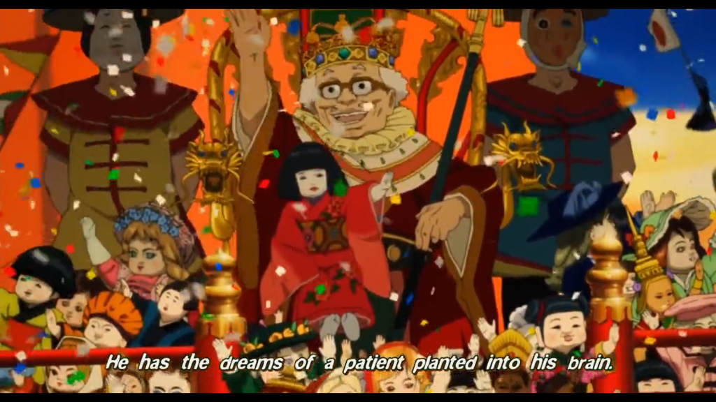 In a less violent way, Konokawa and Atsuko are drawn toward one another as they recognize each other’s energies as they meet in a physical space for the first time, through the now public investigation of the effects of the psychotherapy machine now known. Tokita explains to Konokawa, “Isn’t it wonderful? The ability to see a friend’s dream as if it were your own. To share the same dream.” Though they separate, pursuing different threads of thought with the investigation, the parade continues marching as Tokita, Konokawa, and Paprika are swept up in its delusion. With Tokita swallowed up by the nightmare parade now exponentially spreading throughout the city in his reckless attempt to rescue Himuro, Atsuko, instantaneously transforms into Paprika and dives into Tokita’s merged dream on a mission to save him. With the development of the project and the lives of everyone at stake, Paprika flits through the nightmare with the Chief monitoring her as she looks for clues. As she peers further into the unstable construction of the dream space, moving past the superficial layers, Paprika is led down the ever-shifting mayhem of the ever-evolving mystery, and she, too, becomes caught up in the delusion.
