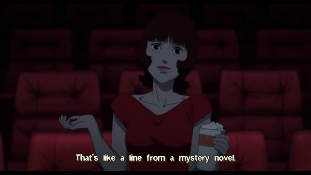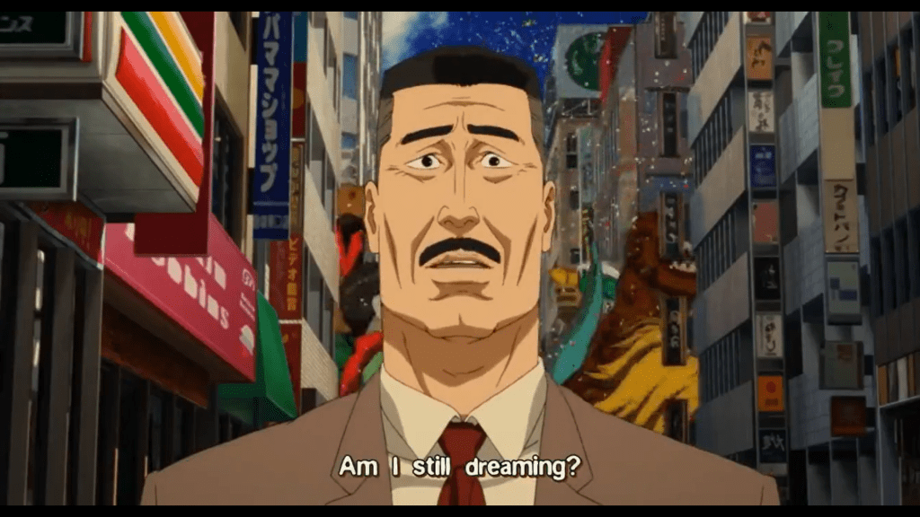 “I—it’s the greatest showtime!” Konakawa, a police detective who has come for help with a diagnosis of anxiety neurosis from a murder case he’s been stuck on and affecting his sleep, wakes up with a start to a young, cropped bob red-headed woman named Paprika. After what is recognized as a dream sequence captured by the psychotherapy machine called the DC mini, Paprika and Konokawa begin a dream analysis. Paprika breezily speculates and deconstructs Konokawa’s dream, similar to a film analysis starting with genre, style, characterization, and motivation. Scheduled for another session, just as soon as the girl of our dreams has arrived, she’s off and gone again to another dream.