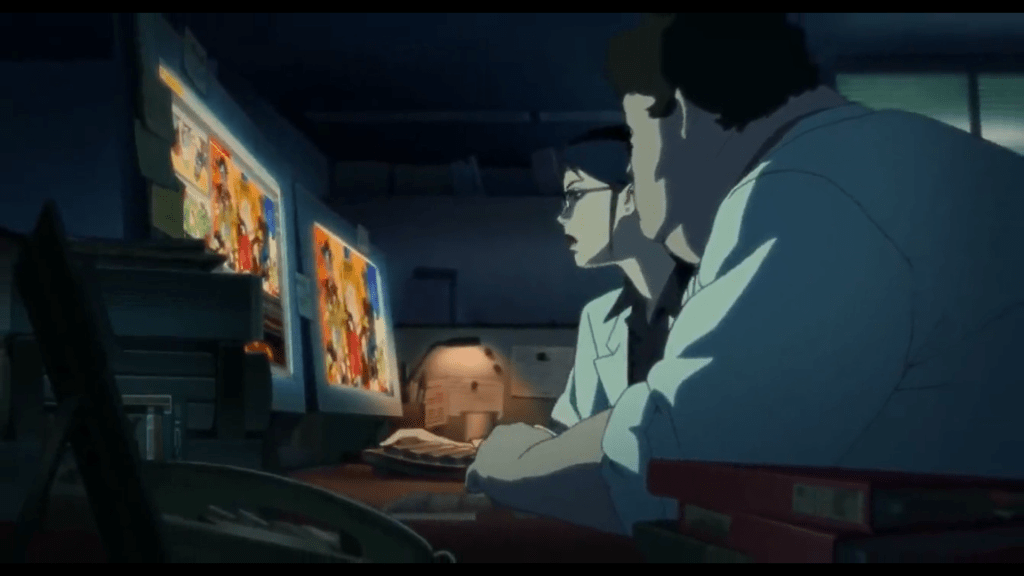 Zooming out of a computer screen with the Chief hooked up to medical and imaging machines in another room, Dr. Chiba, Dr. Tokita and Dr. Morio Osanai analyze the delusion causing the deterioration of the body and mind. Atsuko and Tokita determine that the terrorist misusing the device must also be watching the nightmare. Buying time before the Chief sinks further into the delusion and on the hunt for a missing researcher named Himuro, who they see appear in the parade, they connect him to the DC mini’s disappearance. In pursuit, Osanai alludes to Atsuko and Tokita that, “a genius produces a lot more than he realizes. Himuro was jealous of Dr. Tokita. Even I feel bitter towards you sometimes, Dr. Chiba. No matter how hard I try, I’m not as good as you. I feel powerless.”