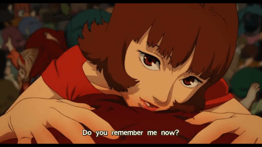 By setting up the film as a psychological thriller, the investigative dream work used to frame the narrative using visual and audible referents, symbols, and totems appear and reappear throughout that, simulates the instantaneous reactivity and loss of control one has over the direction of their dreams though we may appear to have to illusion of control–asleep or awake. Paprika asks Konokawa in a therapy session in an online meeting space with a knowing smile, “Don’t you think the Internet and dreams are similar? They are both areas where the repressed conscious mind vents.” Konokawa, while interested in the analysis of his dreams, also diverts his attention to learning the other identity of Paprika outside the virtual and dream space, but is baited back into speaking about his past and is forced to confront the true nature and the source of his anxieties. At the same time, the dream transmission continues to spread, causing reality and the dream space to overlap more with increased cases of those being affected, suffering the same nonsensical violence and destructive consequences left behind. This paralleled with the team now being restricted from using any other psychotherapy machines as ordained by the Chairman condemning the project entirely, Atsuko recognizes an image of a character on Tokita’s shirt as they dismantle the lab’s equipment. Using her intuition and seeking out the same theme park that she first entered in Himuro’s apartment, Atsuko and Tokita recall the uncanny details of the imaginary space. Hanging in this suspense of deja vu, as they find the doll where the previous dream ended, Paprika suddenly appears to warn Atsuko just as Hirmuro’s body comes crashing through, barely sparing her from being crushed.