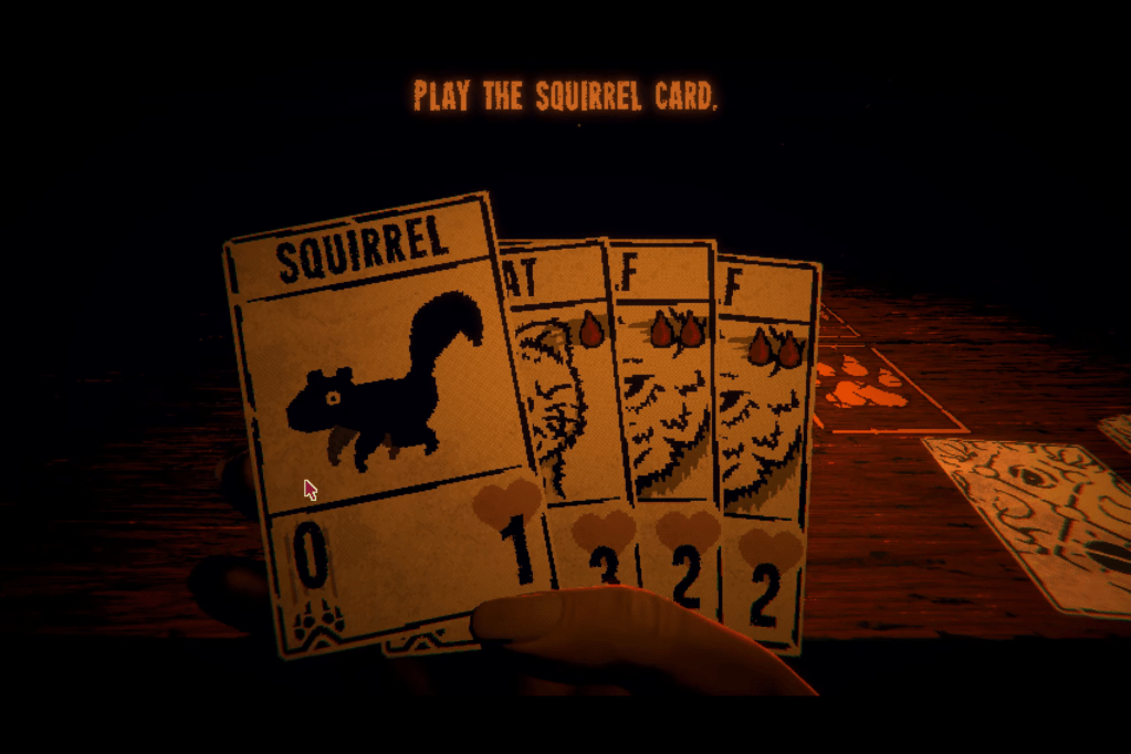 Video games are always fun for me, especially in the way they immerse you and make you participate as a player. While with movies you only have to watch what the characters are doing, video games demand you to take action, and require you to move and make decisions for the character you control. This sense of control can be frightening, especially in horror games that put your character’s life at risk, where you must play for your survival, requiring you to kill enemies brutally. Inscryption (2021, dir. Daniel Mullins) is a horror video game that starts in a locked cabin where your captor Leshy introduces a nature based card game you are obliged to play. Leshy, as the game’s creator, has the power over the very game you play. He dictates not only what you are able to do as the player with the rules he sets but has control over the spirits of other living beings in the game. This sense of power is seen through the cards that Leshy deals out that represent various animals. As you collect cards it makes you contemplate if your deck is alive and what control Leshy has over the spirits that reside in the cabin. I will share my experience with this phantasmagoric aspect of the game through one of my playthroughs and explain why it makes me believe that I participated in the torture of animals through Leshy’s game of cards.