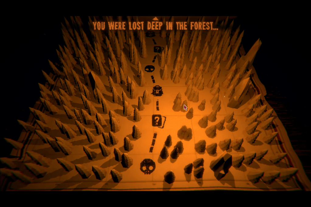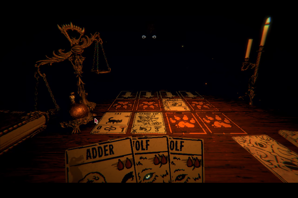 As mentioned, Inscryption is first set in a locked cabin and I find myself at a dimly lit table. Leshy reveals himself with a set of glowing eyes and teaches me how to play his card game. Cards enter my virtual hand and a board appears on the table. The cards are different kinds of animals that I can use to attack him or to defend myself from the creatures Leshy plays on his side of the board. On my left, a scale appears which tips with golden teeth depending on who gets attacked. If I am able to tip 5 teeth to his side, I will win. But I will lose if Leshy tips it all the way to my end first. Playing one game of cards is brief and after winning my first game Leshy introduces a map of a trail.