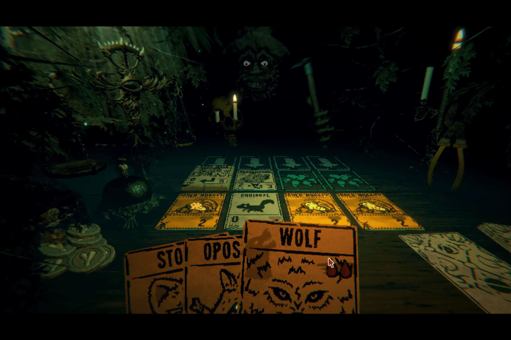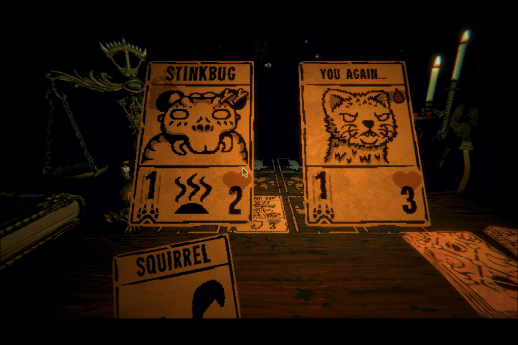 While all cards are silent, there are three exceptions. The Stoat (weasel), Stunted Wolf and Stink Bug are able to express themselves emotionally and speak to me directly. The Stoat is the first to speak to me, addressing how he feels tormented by Leshy who wants to watch him continuously suffer as he gets killed by different animals. After I find the other two speaking cards they speak to each other briefly. They have a light animosity towards each other but cooperate with me as they want to escape the cabin and the games that they participate in against their consent. Through expressing their thoughts it is clear that they are also being tormented by Leshy’s game. Arguably they are in a vulnerable position where they have to play under my whim as the player, deciding over their lives as cards. The three of them however encourage me to beat Leshy, knowing that I am their best chance to find a way to overcome him and to end the games we play.
