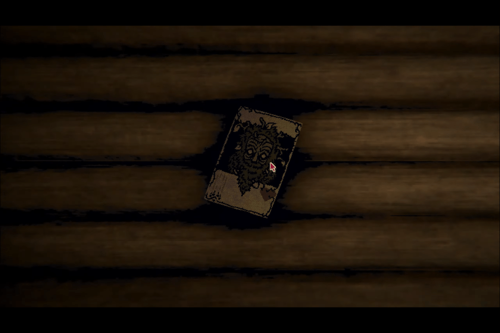 Often in games the player experiences death, having a “game over” moment only for you to restart and play again. It makes me think that in some ways the character I played with has died and a new person is now locked in the cabin. This is further emphasized when I find a card of a human ink figure with the name I previously gave. The next time I lose I will have to give another name for the new person I play as. My interpretation is that Leshy taking a photo may have captured the life of the character I played but I am in some sense completely oblivious to. Some games make it obvious what character you are playing but in this part of the game it is like you are playing an expressionless character. This technique allows the player to further immerse themselves in the game whilst you are playing. Being oblivious to the character that I embody has no scarring impact on me, but it does have an ominous consequence that each time I lose a game Leshy will kill a person.