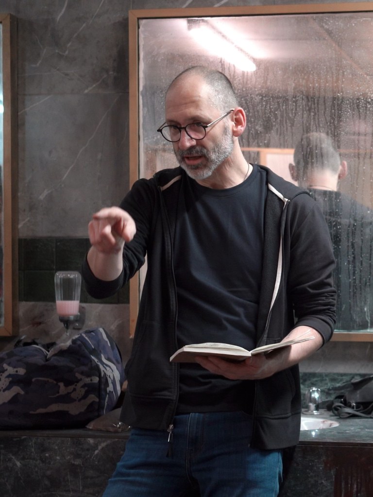 The whole process of living together became part of the performance. Coexistence itself was like a staging exercise, because every day we would talk. Of course, there were about thirty of us in the bathroom. Thirty! So sometimes we had to create these small micro-scenes among ourselves. Like, “Hey, let’s add this here, let’s try that,” because maybe the shot was on Almarales. Then we’d ask, “Okay, how can we support Almarales so that it works? How can we give him another angle, another focus?” It was a completely collective effort, the kind of thing you’d call collective creation, all guided, of course, by Tomás.